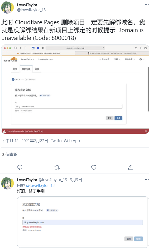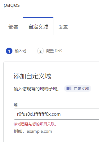 在测试第一个项目时绑定了 r0fus0d.ffffffff0x.com 域名,但删除第一个项目后,看上去绑定关系还是存在,dns记录中也并没有记录,这种情况下 pages 中域名就不能被使用了