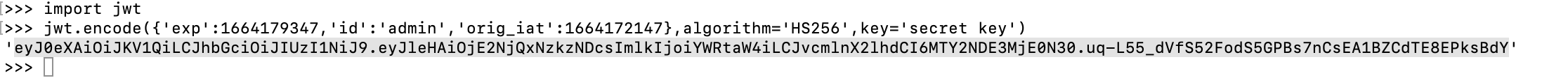 jwt.encode({'exp':1664179347,'id':'admin','orig_iat':1664172147},algorithm='HS256',key='secret key')