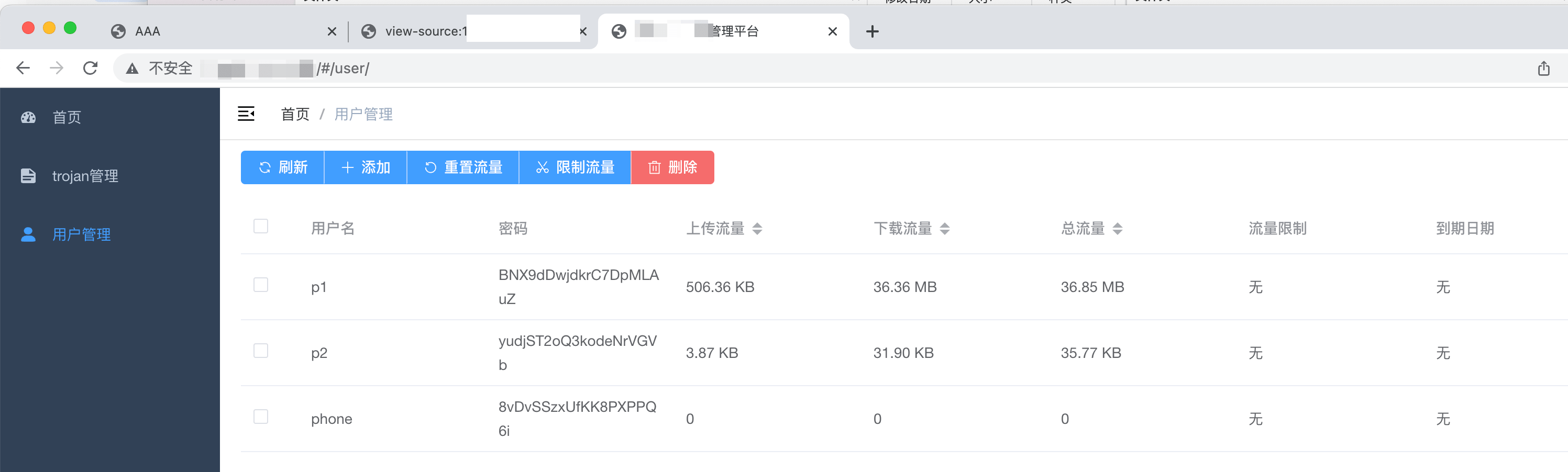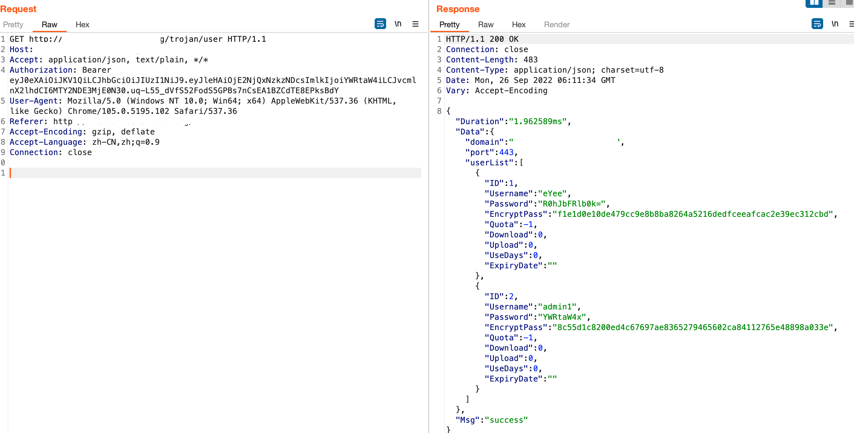 通过这个token访问 /trojan/user 接口可以得到除admin外所有用户账号密码,以及服务的对应域名