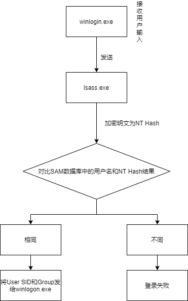 当用户登录时,将用户输入的明文密码加密成 NTLM Hash,与 SAM 数据库文件中的 NTLM Hash 进行比较。