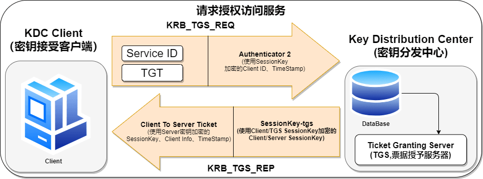 Authenticator2、TGT、Service ID(要请求的服务 ID)发送给 KDC 中的 TGS。- 由于 TGT 是使用