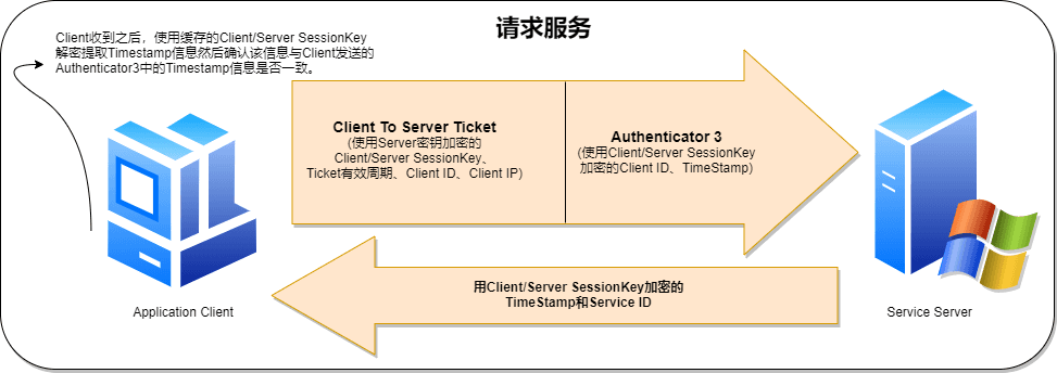 Client/Server SessionKey解密提取 Timestamp 信息,然后确认该信息与 Client 发送的 Authenticator3 中的 Timestamp 信息是否一致。验证通过后,在定义的通讯周期内,Client 可以使用票据请求 Service。由此完成了 Client 和 Service Server 的双向认证。