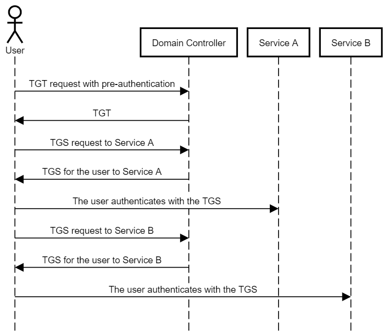 用户在 Kerberos 认证中访问服务 A 和服务 B 的过程图: