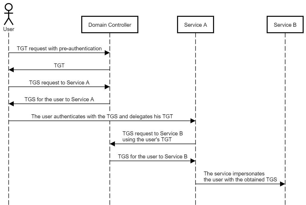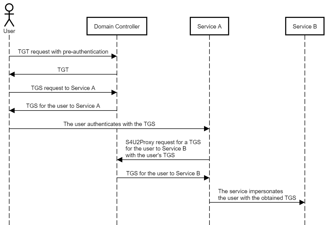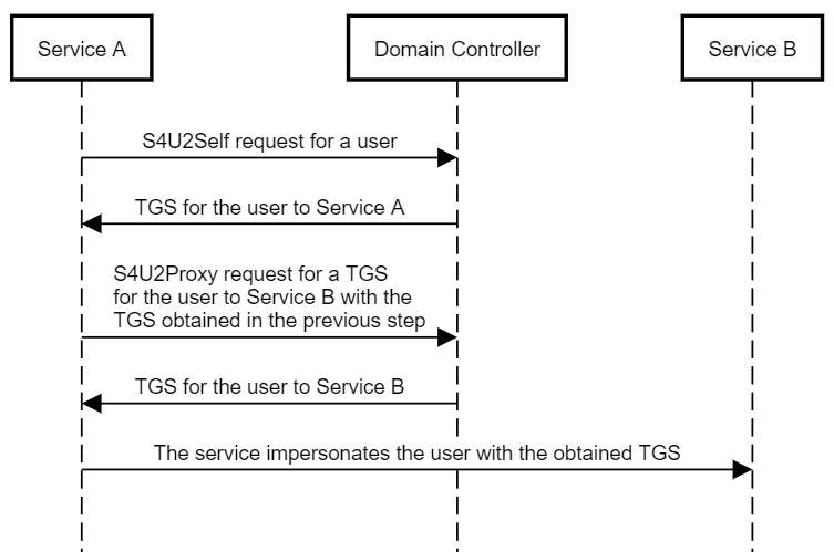 若服务 A 允许委派给服务B,则 A 能使用 S4U2Proxy 协议将用户发送的 TS(图中的 TGS,TGS 必须是可转发的) 再转发给域控制器认证,为用户请求访问服务 B 的 TS(图中的 TGS)。接着,服务 A 就能使用新获得的 TS(图中的 TGS)模拟用户访问服务 B: