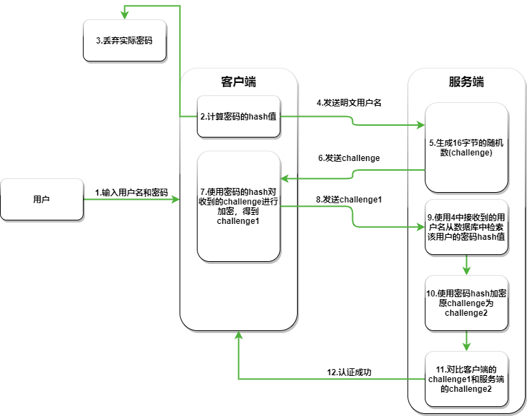 这个过程客户端接收到 challenge 之后,使用用户 hash 与 challenge 进行加密运算得到 response,将 response,username,challenge 发给服务器。消息中的 response 是最关键的部分,因为它向服务器证明客户端用户已经知道帐户密码。