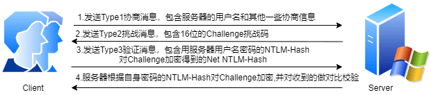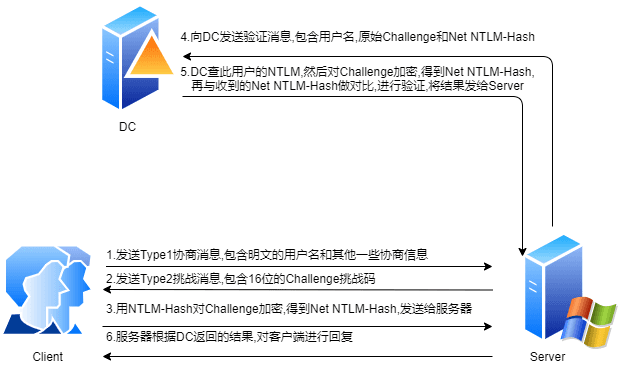 服务器在收到 Type3 的消息之后,用自己的密码的 NTLM-Hash 对 Challenge 进行加密,并比较自己计算出的 Net NTLM-Hash 认证消息和客户端发送的认证消息是否匹配。如果匹配,则证明客户端掌握了正确的密码,认证成功,否则认证失败。