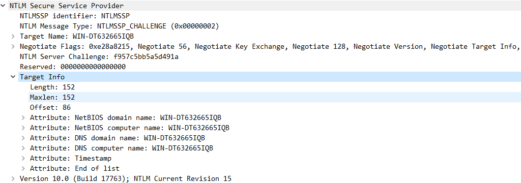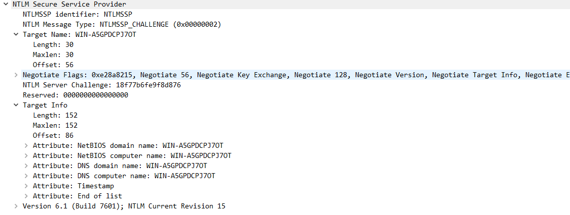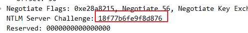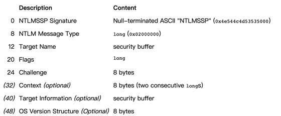 服务端接收到客户端发送过来的 TYPE 1 消息,会读取其中的内容,并从中选择出自己所能接受的服务内容,加密等级,安全服务等等。然后传入 NTLM SSP,得到 NTLM_CHALLENGE 消息(被称为 TYPE 2 消息,Challenge 挑战消息),并将此 TYPE 2 消息发回给客户端。此TYPE 2消息中包含了一个由服务端生成的 16 位随机值,此随机值被称为 Challenge,服务器将该 Challenge 保存起来。