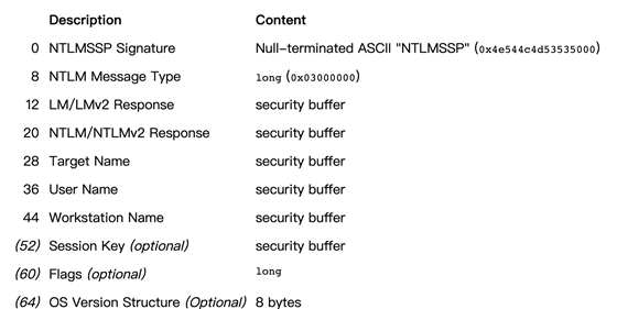 客户端收到服务端返回的 TYPE 2 消息, 读取出服务端所支持的内容,并取出其中的随机值 Challenge,用缓存的服务器端密码的哈希值 NTLM-Hash 对其进行加密,得到 Net NTLM-Hash(加密后的 Challenge),并且将 Net NTLM-Hash 封装到 NTLM_AUTH 消息中(被称为 TYPE 3 消息, Authenticate 认证消息),发往服务端。