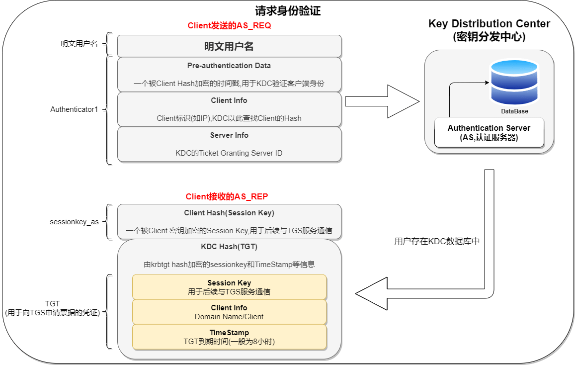 TGS 密钥(krbtgt 的 NTLM Hash)加密的,Client 无法对 TGT 解密。 - 如果假设这个数据被中间人窃取到,也无法在短时间内破解,因为 KDC 会校验时间戳。